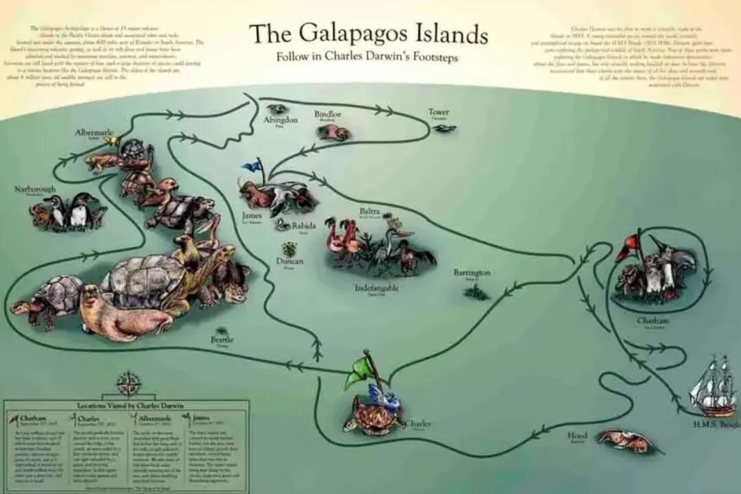 1835年,达尔文踏上加拉帕戈斯群岛。这里距离南美大陆约1000公里,由海底火山喷发形成7座大岛、23座小岛和50余个岩礁。