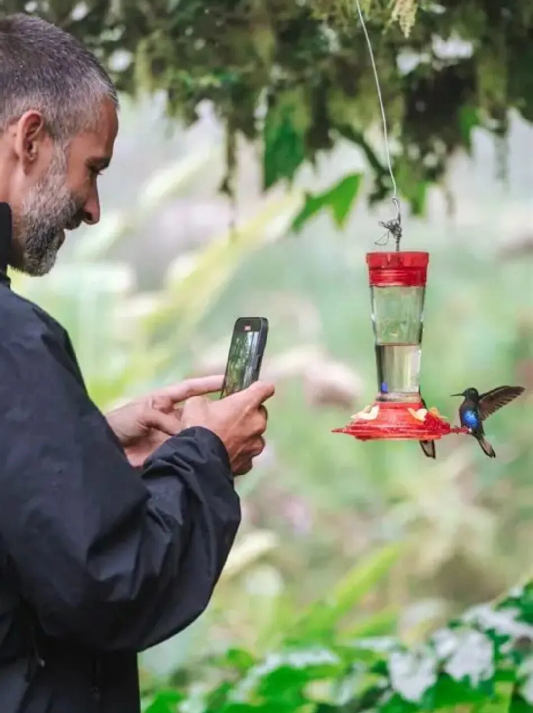 在云雾森林,你可以手持喂食器,近距离地等待蜂鸟悬停掌心。