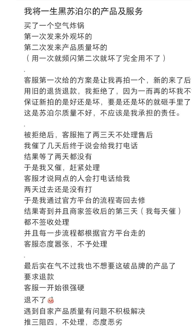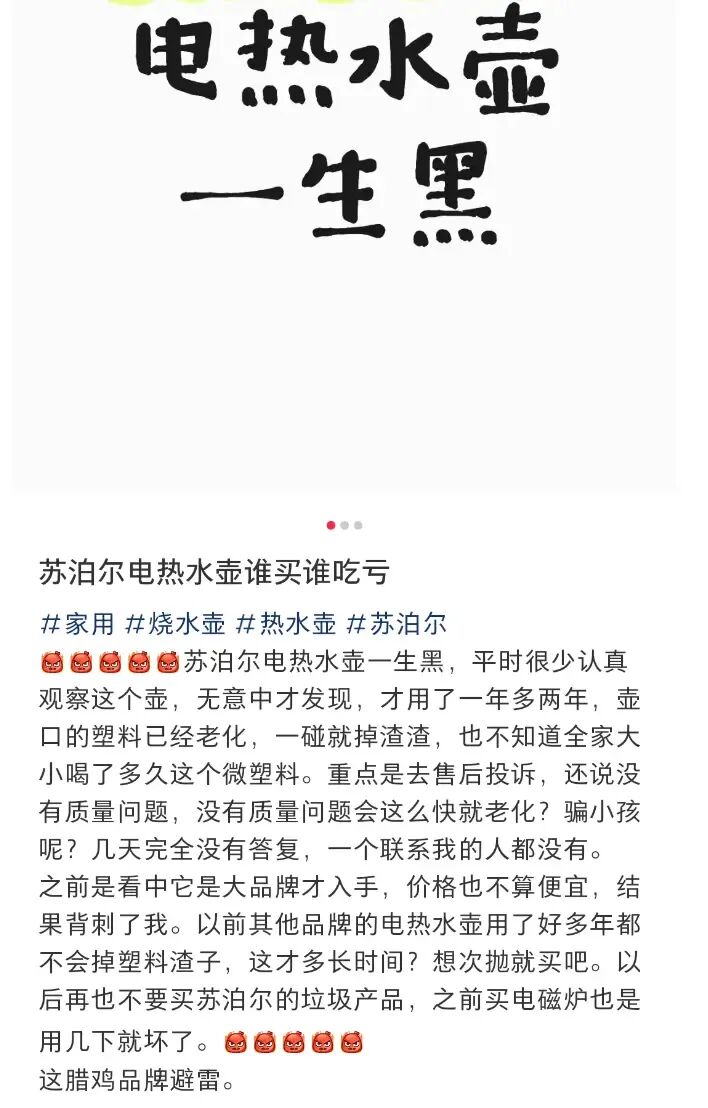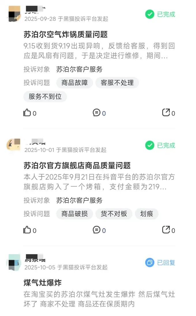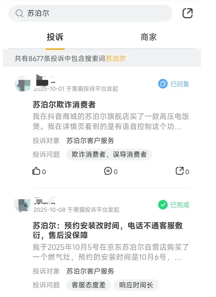 ▲(图源:公告)当外部结构如此脆弱时,近年来苏泊尔的产品安全问题不时引发关注。在黑猫投诉 【下载黑猫投诉客户端】平台上,有超8000条关于苏泊尔的投诉,多款产品被曝存在安全隐患,包括煤气灶爆炸、炒锅涂层脱落、玻璃盖爆炸、电煮锅底部进水导致线路短路等。